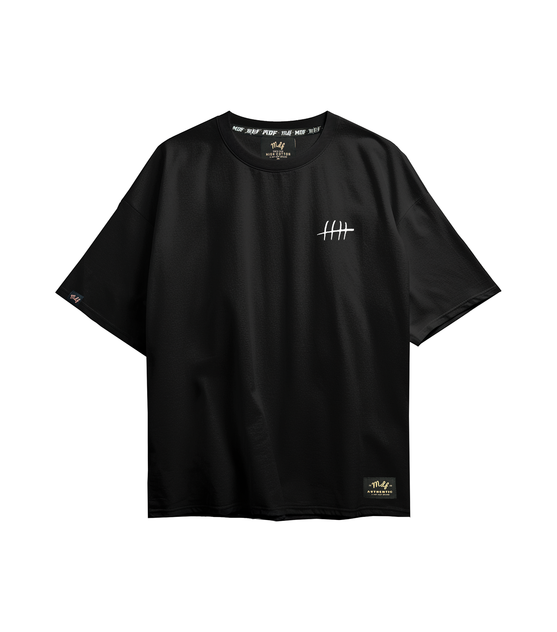 Polera "5 Live´s", además la polera tiene etiqueta MDF® Authentic en el costado inferior, etiqueta pequeña en la manga MDF® del lado izquierdo y tapacosturas en el interior atrás encima de la etiqueta de la talla con diseño "Typhes" de color blanco. Es una polera con un corte que conceptualiza el Hip Hop al entregar un estilo Oversize a la hora de usarla.